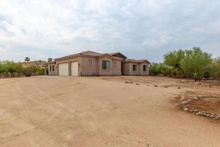 Move-in Ready! Nestled on 1.2 Acre, serene desert property, very quiet and private, a quality built 2x6 framed custom home in highly desirable Desert Mountain area, with NO HOA! North/South exposure with beautiful desert and mountain views. Inviting brick-arched private courtyard entrance. Open the door to a welcoming spacious living room, and travertine tile in all the right places. Brand new carpet/padding throughout. Kitchen boasts granite countertops and large island with upgraded alder wood cabinets. Laundry room with utility sink and alder wood cabinets. Spacious for gatherings, with dining area and family room complete with a cozy fireplace. Far bedroom practicable for office/den or just a bedroom. Spacious master bedroom with large windows, and separate exit to full-length patio. Master bath equipped with garden jetted tub when you feel like a spa day, generous master closet with shelving. Extended full-length covered patio, great in AZ. Impressive 3-car garage with custom-built cabinets, and a matching floating cabinet island (4'x 8') with huge bin storage that match cabinets. Large lot has an open canvas for expansion like a barn, pool, RV garage, etc. Interior freshly painted, exterior painted Aug 2019, hard wired security system. Custom landscape lighting in front/back yard, must visit at night to experience the tranquil setting. Surrounded by mountain views, and a natural wash for the ultimate desert living.
