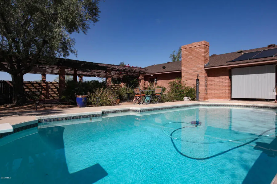 Move-In Ready Home On Over 1 Acre & No HOA. Large Circular Driveway In Front. Private Fenced Yard w/Huge Covered Patio & Solar Heated Pool. Additional Land Behind Fence For Toys Or Horses. Home Recently Updated w/Wood Plank Tile, Some Kitchen Appliances, Cool Deck (17), Water Heater (16), Windows (15), & Newer Roof (12). Kitchen Has Granite Tile Counters & Tons Of Cabinets For Storage. Large Master Bedroom w/En-Suite Bath Features Dual Vanity & Shower. Other Bedrooms/Office Split. Spacious Family Room Includes Wood Fireplace & Bar For Entertaining + French Doors To Private Patio. Shed w/Electric In Back + Detached 2 Car Garage With A New Opener/Door. Close To Golf, Shopping, Restaurants, Medical, Entertainment, Freeways, Etc. Dont Miss Out On This Beautiful Oasis In The Desert.