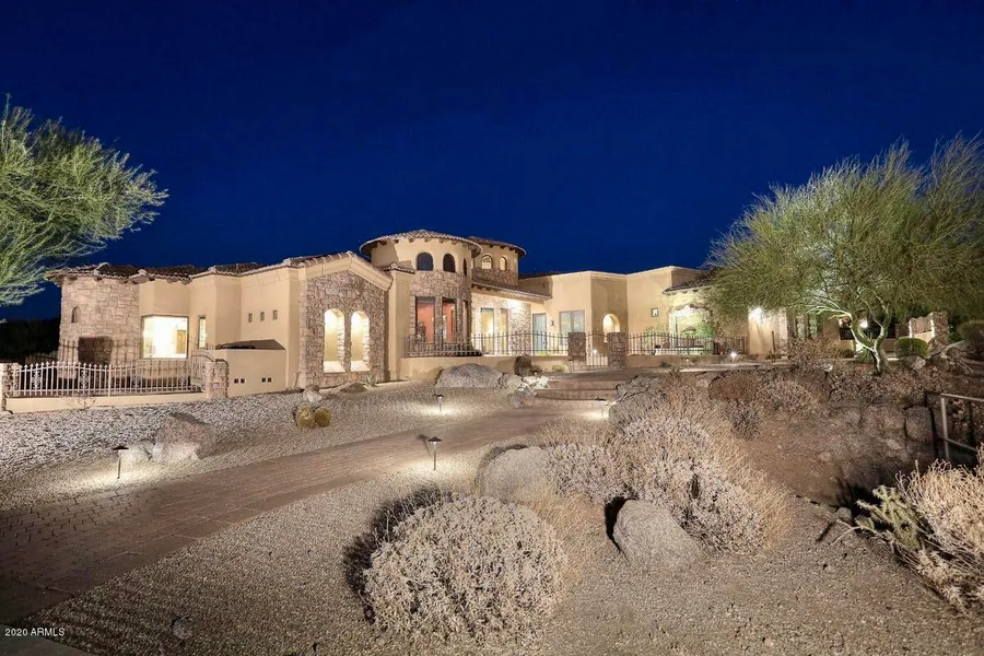 Gorgeous Custom Tuscan Retreat in Las Sendas, located on a large corner lot with breathtaking views of majestic Red Mountain that offers amazing views of the city lights at night. No expense was spared to ensure great attention to detail, from the custom built in cabinetry and the polished travertine flooring, to the amazing private movie theater. There is a gated motor court that leads to 6 garage spaces, including an air conditioned over height garage. Each of the 4 bedrooms & the office have their own bathroom & their own exit to a private patio. The one of a kind pool with a water feature coming off the observation deck, fire feature & cascading waterfall Cantera steps is the show piece of this private retreat. The disappearing wall of glass leads to an outdoor fireplace & built in BBQ. The kitchen has 2 dishwashers for when you have large gatherings and the master bathroom has a steam shower, so you can relax afterwards.
