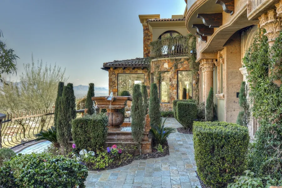 Gorgeous views, exquisite ornate details, masterfully designed, and expertly crafted, this grand guard-gated estate exudes elegance. Thoughtfully positioned on a large, private, and quiet hillside lot, the home blends beautifully with the mountain terrain, and offers breathtaking views from its elevated position on Mummy Mountain. The home showcases exceptional craftsmanship, materials, and design. Marble and wood floors, custom millwork, coffered ceilings, fine marble countertops, French doors, and 8 gorgeous fireplaces, flawlessly create an ambiance of beauty and quality. Whether hosting a black-tie event or enjoying a small intimate gathering, all will be touched by this truly extraordinary estate.
