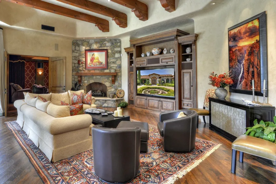 Elegantly appointed and privately gated, this European inspired property offers spacious grounds & interiors creating the feel of a very private compound. Large Palladian windows frame the views of the outdoor pool & fountains, & lushly landscaped gardens, as seen from the floor to ceiling Venetian plastered walls T/O. The Master Suite has a gracious entry, private patio & waterfall, separate His & Her closets, W/C's, vanities. Her closet is magnificent! Handsome study nearby, wide hallways w/ art lighting, Butler's Pantry designed to serve both living and dining rooms. Formal Dining Room incl. temp controlled wine cellar w/ custom stained glass panels. Rich fabrics drape every window. Sumptuous home theater accessed thru fam rm. Separate full Guest House. Court says SELL IT NOW!