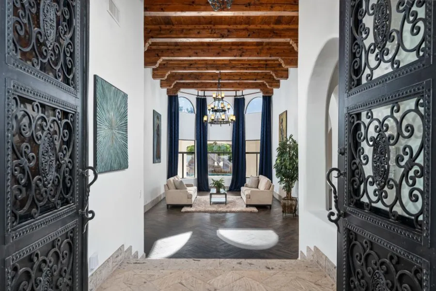Renovated with architectural strength and highly customized French/Spanish elements. This richly appointed double gated residence with abundant views of Camelback and Mummy Mountain is impressive. Appreciate aesthetic effects of hand formed cedar plank ceilings, massive ironwork entry doors, raised interior doorways, lighted coved niches, ironwork chandeliers, herringbone floors, added view windows, copper tub, cantera stone baseboards, trim and FPs, fully redone kitchen and baths, zinc high ceiling kitchen range hood and gleaming double oven gas range for a banquet. Enjoy heated slide pool, rock waterfalls, multiple paver courtyards, synthetic turf, and practice soccer field. Stargaze in open sky gazebo with conversation swings. Listen to nearby soothing Casa bells. Exceptional home.
