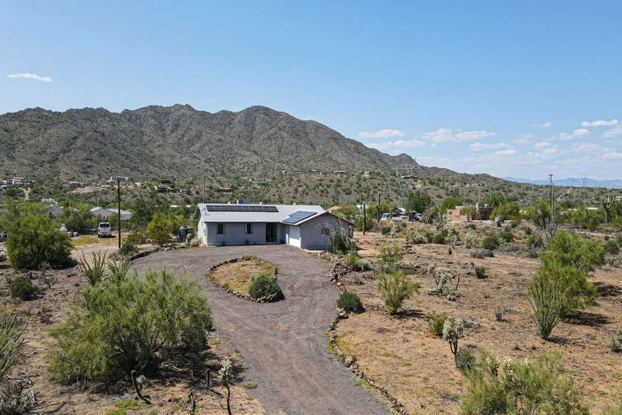 Gorgeous mountain views from every direction on 2.3 acres! The possibilies are endless! You have the convenience of paved roads to home and the location is just outside desert hills, close to shopping. Enjoy the privacy and amazing sunsets from your covered patio. Move in ready and well maintained 3 bed/2 bath with 2 car garage, owned solar and newer roof. Many options to consider on this elevated view lot , either expansion or horse facilities. Home has high ceilings, great natural light, tile flooring, wood kitchen cabinets, generous sized bedrooms, ample closet/storage space and laundry area. Great opportunity to own this amazing az property with endless views!