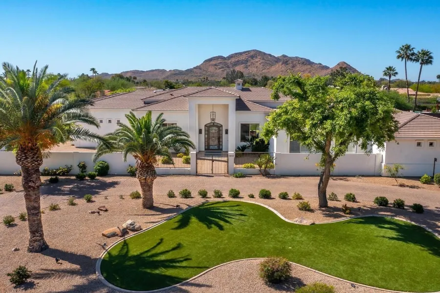 Exquisite Views of Mummy Mountain, Custom home boasts soaring 24 foot ceilings, 8 foot doors throughout with an open flowing floor plan. 5,200+ square feet with 5 en-suite bedrooms and 5.5 bathrooms, a huge chefs kitchen with stainless steel appliances, gas cook top, home theater, spacious great room complete the open concept . The resort back yard of your dreams. Full size sport court, new putting green. Low Maintenance artificial Turf plus a large Built in BBQ and grill station. Sought after North/South exposure lights up Mummy Mountain for cocktails by the pool, private gated driveway and the sliding wall of glass to the patio compliment the outdoor experience. Owned solar completes this luxury compound