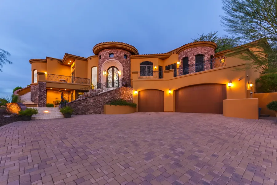 Confident of its stature, this regal Tuscan is one of FireRock Country Clubs finest homes. Perched perfectly on over an acre with prominent golf course, city light, and massive mountain views. Step inside and instantly notice incredible Cantera, granite, and chiseled travertine details found throughout the home. Designed to capture the views, outdoor living reaches a new premium with four front patios and a private backyard oasis with waterfall pool/spa built into the hillside. Open to the window lined great room, the kitchen is a true culinary paradise with incredible granite, large island with breakfast bar, 5 burner viking range, walk in pantry, & breakfast room. Compelling rejuvenation, the master suite is complete with its own foyer, study, private balcony, his and her vanities, jetted corner tub, separate shower, and walk-in closet. Completing the main level, two en-suite bedrooms a split from the master with fantastic views and patio/pool access. The lower level completes the estate with a family room with wet bar, media room (or 4th bedroom), and a private covered patio. Hidden features of this home include a oversized 3 car garage with work station, ample storage, central vac, surround sound, and much much more.