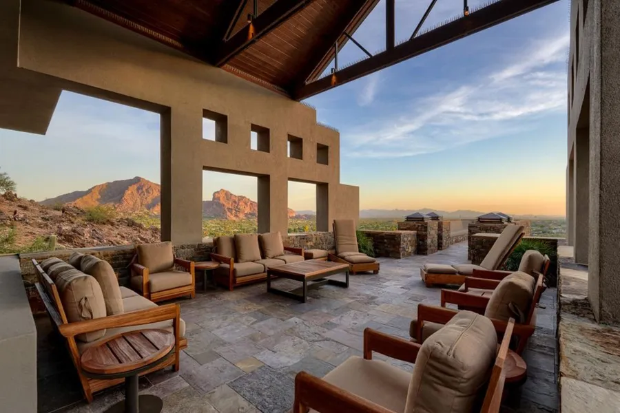 The luxurious Primary retreat is privately stunning, boasting a spa like Primary bath, sitting area and private balcony to soak in the magnificent sunsets. Opposite the Primary is an executive office as well as a spacious secondary bedroom. The lower level features a state of the art Theater Room with a 3D skyline of South Beach, as well as a sensational walk in wine storage area. The media room/flex space has walls of glass that pocket and open to your magnificent infinity edge pool, spa, BBQ area and outdoor entertaining spaces. In the evenings, take in the sparkling city light views and nostalgic Arizona sunsets from the edge of the sparkling pool. Two large ensuite bedrooms are accompanied by another flex area. The detached guest casita with a separate entrance features a sitting area, kitchenette, generous bath, and private balcony.