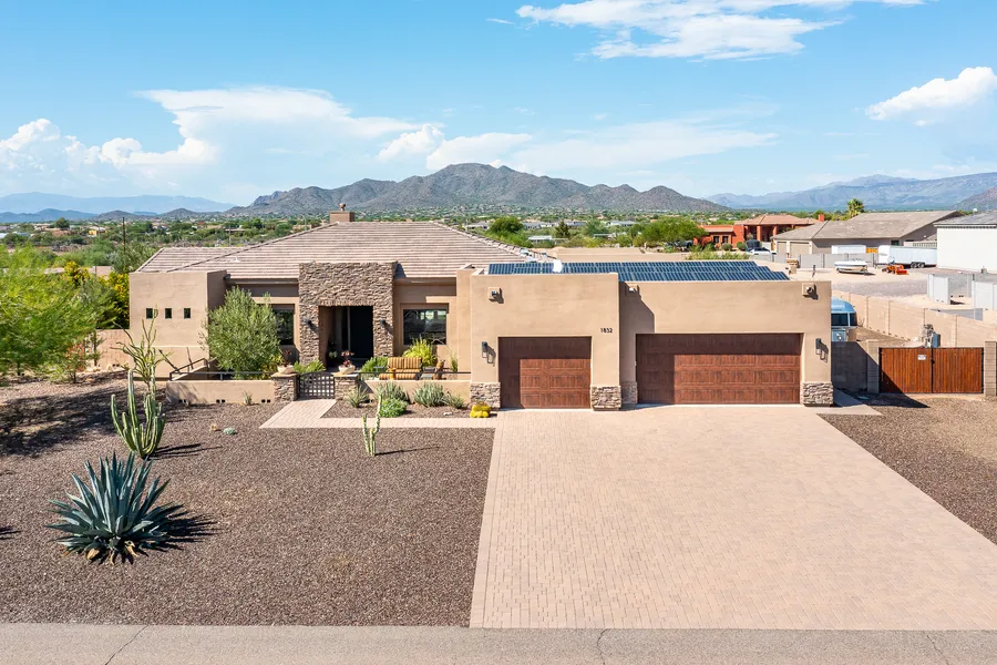 A slice of heaven! A serene private residence with amazing mountain views in the front and back yards. A fantastic retreat, in a desired area, with a more rural setting, open spaces and no HOA. The home offers multiple living spaces to work and play. Outdoor living is at it's finest with a pavered and gated front patio and a resort like pool area, built in 2019, in the backyard. This home is well maintained and efficient with a fully paid for solar system. It has a great floor plan with a master split and an open great room, and, has all the desired finishes of today; wood like tile floors, clean lined shaker cabinets, granite counters, stone detail on backsplash and fireplace, solid alder doors throughout. RV hook up and RV gate, oversized garage, EV charger circuit. Cabinets and bench for a workshop in the garage. Built in custom cabinets in great room. Many more features.