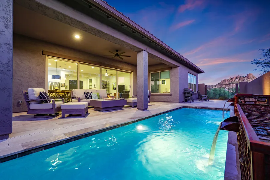 2018 Taylor Morrison built home in the gated community of Ironhorse in North Scottsdale, features a modern great room floor plan with no interior steps! The corner cul-de-sac location has Natural Area Open Space to the back and side of the home for additional privacy. Enjoy Troon Mountain, boulder outcroppings, and Pinnacle Peak views from the expertly designed backyard. Backyard includes a covered patio with pocketing doors allowing seamless entertaining from the outside in, a play pool with custom copper and rock water feature, travertine hardscape, side patio with view fencing, and low maintenance landscaping. Inside you will find three bedrooms, two and half baths, and an office currently used as an exercise space.