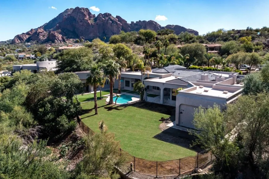 Refined bespoke luxury, extensively remodeled this Paradise Valley custom estate is simply a showstopper. Dramatic drive-up boasts a grand arrival, overlooking majestic mountain views of Camelback and Mummy Mountains this modern transitional ranch offers a well-planned design and alluring interiors throughout. Perfectly positioned on an acre plus homesite, this impressive estate with remarkable curb appeal is full of character for the most discerning owner. With 6 bedrooms, including a separate 1325 sq ft guest residence with private entry and access to outdoor living, 6.5 bath, home theatre, unique at-home pub with bar seating space for 10, and adjacent game room, this estate prominently offers it all. Expansive open kitchen with 15' oversized quartzite eat-in island, stylish Distinctive Custom Cabinetry, with spacious family room opening seamlessly to vast outdoor living. Transformed with the finest finishes including natural wide plank oak wood flooring, fresh interior and exterior paint, new roof, striking restoration hardware style lighting fixtures, modern woodwork, tile accents and surrounds, and fitting wine wall in dining room. The private owner's suite overlooks the expansive grassy backyard and claims abundant natural light, with spa-like bath and large exercise room you will have your own wellness retreat experience every day. The sprawling back yard boasts scenic mountain views, with pool and spa and putting green with generous space for limitless opportunity for personal design.