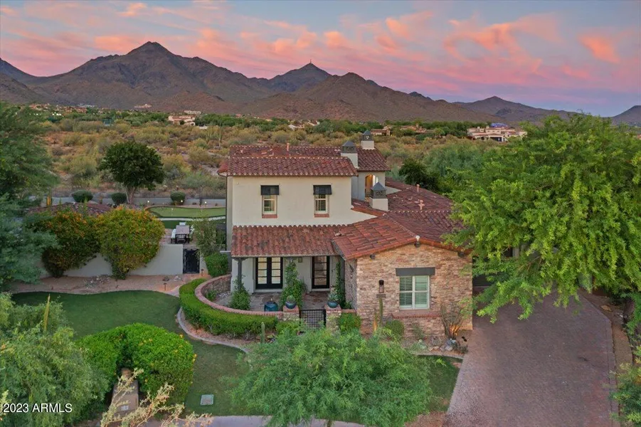 Sweeping mountain panoramas are the backdrop to this stunning remodel in the coveted enclave of the Haciendas in DC Ranch. This unique property sits at the end of a cul-de-sac on a premium lot, backing to the Reata Wash. 160+ feet of view fencing allows unobstructed breathtaking views of the McDowell Mountains and Sonoran Desert. Carefully curated spaces with architectural and designer touches highlight the best of indoor and outdoor living. Open the custom steel entry door to reveal a graceful arched hallway leading to the formal living room, office, dining room, and inviting interior courtyard with gas fireplace. The elegant owner's suite with sitting room and private patio is also located on the first floor. Upstairs you will find a spacious bonus room along with... a covered outdoor patio with fireplace overlooking the interior courtyard. A guest bedroom with charming Juliet balcony and ensuite, and two additional bedrooms with Jack & Jill bath complete the second floor. You'll love the calm vibe of the remodeled kitchen featuring a concealed coffee bar with fold-in pocket doors, custom wood cabinets, open shelving, quartz countertops & backsplash, and top-of-the-line appliances. A butler's pantry adds additional storage and easy flow between kitchen and formal dining. Striking wood beams in the kitchen and family room contribute to the cohesive feel between spaces. Folding glass doors facilitate a seamless transition from indoor to outdoor lounge and entertainment areas. The outdoor living experience is truly special with a heated 58,000-gallon saltwater pool, spa, gas fire pit, putting green, raised patio with fireplace, and covered ramada with bbq & dual refrigerators. The recent remodel included the addition of a large slider in the kitchen for convenient access to the ramada; as well as, adding a bathroom with shower, accessible from the pool.