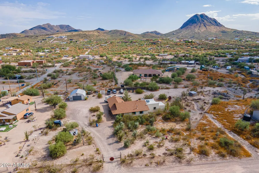 North Valley 4 bed 2 bath home with 25 x 27 Quonset hut complete with swamp cooler and concrete floors on 1.2 fenced acres with 360 degree mountain views. RV hook up, 2500 gallon water storage tank,Tile and carpet floors, stainless steel appliances, wood burning stove in family room ,separate laundry room, wrap around covered patio,2 car main garage. Currently chickens and goats on property & could easily add horse barn and facilities if wanted. Minutes to access I-17.