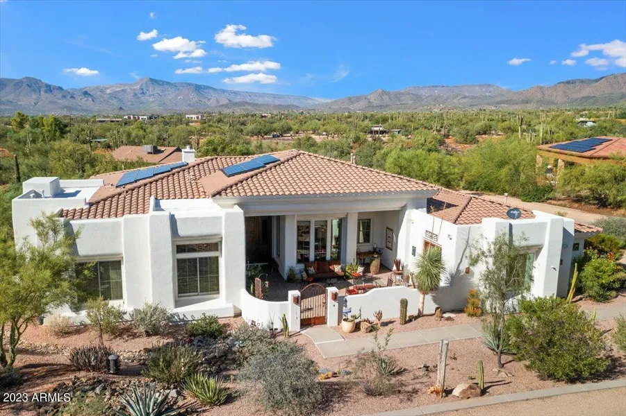 This Santa Fe style home offers a unique and private retreat. Tucked away amidst lush trees, it provides a sense of seclusion from the street.The approach to the house is adorned with thoughtfully arranged desert gardens, featuring distictive art and potted cacti, creating a charming and welcoming atmosphere. The courtyard has been extended to maximize the picturesque view of Black Mountain providing a tranquil oasis within the residence. Upon entering through the gate, one's gaze is immediately drawn to the exquisite custom mesquite entry door, adding a touch of elegance to the space. The primary bathroom, as well as the guest bathroom, received a tasteful remodel in 2018. The floors have been updated with engineered hickory hardwood. The Casita underwent a renovation in the same year. The interior of the home is flooded with natural light creating a warm and inviting ambiance. The dini...