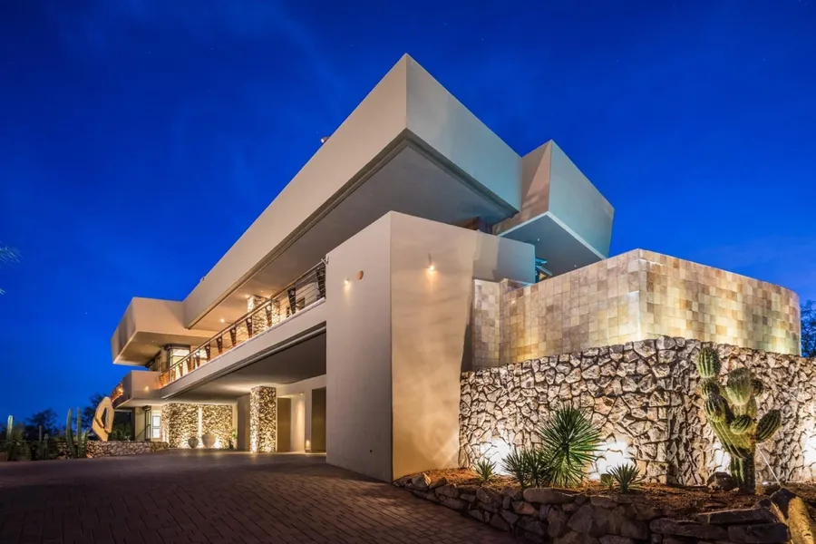 Mastery of architectural art awaits. This is the FireRock residence that truly combines timeless design with unrivaled views. From the moment you step onto the property, a panorama of emerald golf course fairways, mountain silhouettes, and city light views will take your breath away. Enter the foyer where a custom two-story master-crafted sandstone and water feature teases your senses and invites you to explore the style and tranquility of this two story-home. Accessible from the 1st and 2nd master suites, a lush courtyard with a whirlpool spa and fire-pit with bench seating blends into the overall wrap-around deck, providing multiple entertaining vignettes, a BBQ, and an elevated negative-edge pool overlooking the fountain of Fountain Hills and nearby mountain ranges.