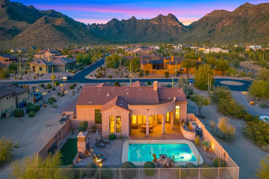 Situated on a secluded cul-de-sac in the privately gated Tonto Forest Estates, this desert jewel sits on just over an acre at the base of the Tonto National Forest. Offering convenient access to numerous parks, hiking and biking trails, recreational sites, Loop 202, and all-encompassing views of the Superstitions, Usery, and Goldfield Mountains, this home is the ultimate urban retreat. Enter through the elegant paver-lined courtyard to find a tranquil water fountain, custom front security door, and an open, light-filled floor plan with views of the Tonto Forest from nearly every window. Interior elements include oversized windows, granite countertops, fresh interior paint, neutral tile, wood and plush carpeting. Custom wood and built-in storage adorn the great room, primary suite, and private den. Step through elegant french doors to your expansive covered patio, where a private pool, built-in BBQ, and ambient outdoor fireplace await your enjoyment. Enjoy an extended driveway, with paver walkways, custom wrought iron gates, and an epoxy garage with floor-to-ceiling cabinets. Elevate your lifestyle, and embrace the tranquility of nature in this exceptional desert retreat!