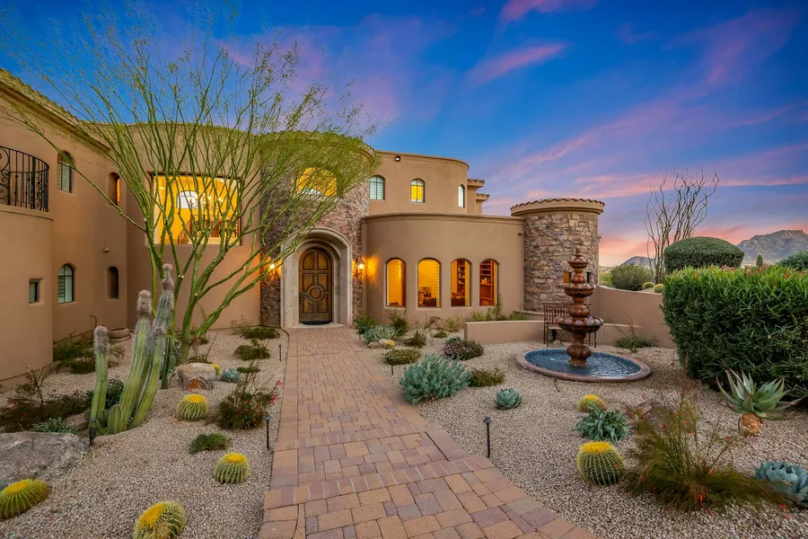 Situated within the prestigious, guard-gated Troon Village community, this remarkable residence seamlessly combines refinement & comfort. Offering breathtaking vistas of the iconic Four Peaks Mountain, this home promises an unparalleled living experience. Its spacious layout unfolds effortlessly, unveiling a meticulously designed haven crafted for both relaxation and entertainment. This turn-key, fully furnished home is ready for immediate occupancy. Boasting dual primary suites, one on each level, this residence offers flexibility and convenience. Ascend the staircase (with the option to add an elevator near the grand entrance) to reach the upper primary suite, adorned w/ luxury finishes. Meanwhile, the lower suite pampers with a sumptuous bath featuring a steam shower & exercise room.