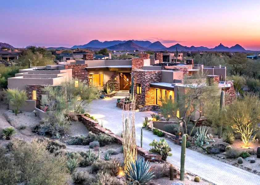 Stunning Southwest Contemporary Estate with Desert Mountain Golf Membership available to Buyer! Impressive curb appeal with gorgeous landscaping, artisan crafted entry door, and copper garage doors. Dramatic living room with retractable glass doors that open to covered, heated and misted patio with infinity edge pool, for gracious outdoor living and entertaining. Panoramic views are enjoyed from the wraparound resort style patio with coveted south orientation overlooking Renegade's 3rd fairway and Arizona's iconic mountains and sunsets. Masterfully created by renowned builder, Bob Byrd, featuring details including extensive internal and external stacked whole stone walls, slate, granite, marble, luxurious Honduran mahogany cabinetry and doors, plaster lath walls with Venetian plaster treatment, and 4 internal/2 external gas fireplaces, and copper fascia. A major addition and new update b...