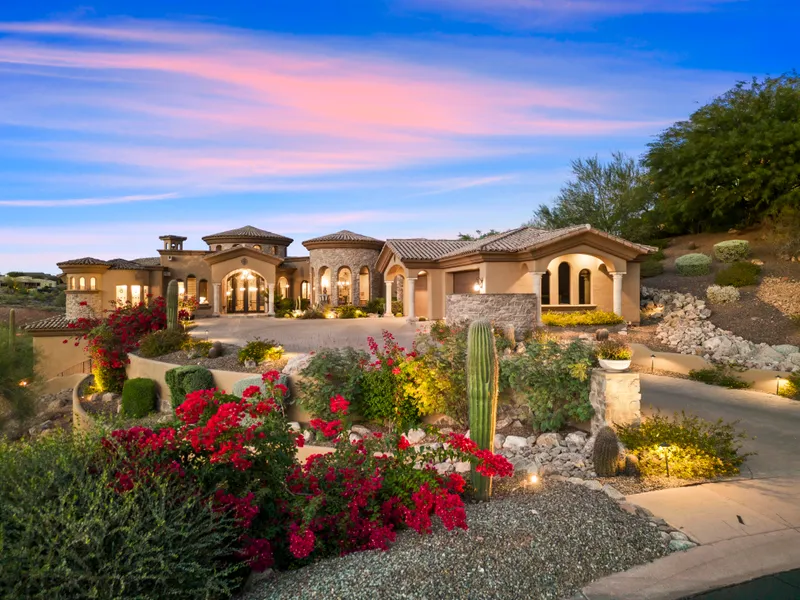 Live lavishly. Entertain effortlessly. An estate worthy of trendsetters being sold FULLY FURNISHED. If stunning mountain and emerald golf course views, twinkling evening lights and luxurious indoor/outdoor living are important to you, then this exquisite Mediterranean home within Firerock Country Club is the one. Sold fully furnished, this property is a rare gem. Tucked at the end of a quiet cul-de-sac and adjoining 22 acres of Golf Course Fairways and open natural desert, enjoy a level of tranquility rarely found. As a premier architect within FireRock, Bonnie Tuttle combined functionality and convenience with a smart floor plan and quality craftsmanship . The stately foyer welcomes you to a spacious great room surrounded with incredible finishes including beamed ceilings, ornate ironwork, cantera fireplace, and telescoping walls of glass. The expansive gourmet kitchen is complete with furniture grade cabinetry, Wolf appliances, and a convenient layout. Compelling relaxation and rejuvenation, the master retreat is surrounded by more fantastic views, cantera fireplace, and a massive en-suite providing dual vanities, oversized walk-in shower, freestanding jetted tub, water closet, and more. Completing the main level, a wine room, one of two full bars with commercial ice makers, home theater, formal office, laundry, four car garage and an incredible en-suite bedroom with its own private patio are sure to please. Head down your custom circular stairway to the lower level that is an entertainer's dream complete with spacious family room, two additional bedrooms with their own bathrooms, and a large bonus room that could be a 5th bedroom (currently used as a gym and 2nd office). Meander to your outdoor paradise via your covered and open air patios/decks on both levels wrapping the entire back of the home including an outdoor kitchen, heated pool with incredible water features, bubbling spa, no maintenance artificial lawn and dog run, fire-pit, and views, views, and more views! The back of the home adjoins 22 acres of natural area open space providing unobstructed views and an abundance of privacy. Did we mention a four car garage? This home truly has it all! Enjoy a perfectly maintained and upgraded home featuring 4 completely new HVAC systems, new exterior paint, new hot water tanks, new irrigation and landscape lighting, as well as a new copper water line from the house to the street. Live stress free in this pristine and perfect home. Updates to home include: