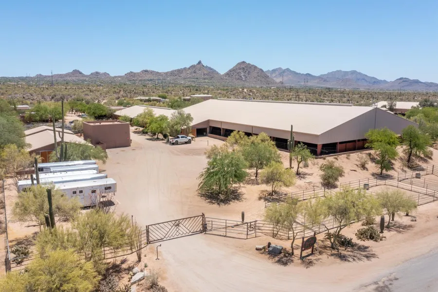 20-acre luxury equestrian training/boarding facility. This established, one-of-a-kind facility has been newly updated. Features include a 34-stall main barn w/ attached 120x240 ft indoor/covered arena w/attached barn office/guest house, 13-stall junior barn, 16-stall mare motel & 3 horse casitas totaling 6 stalls. Other amenities include 150x300 ft outdoor arena, 15 turnouts, round pen, 6-horse hot walker, air-conditioned lounge, vet lab & numerous tack rooms. New duplex bunkhouse for on-site staff (both are 2 bed/1 bath). Additionally, there's an extensively redesigned guest house w/custom Italian finishes. Main home has 4 beds/3.5 baths, chef's kitchen w/ high-end appliances, & resort-style backyard. Close to WestWorld and nearby trails.