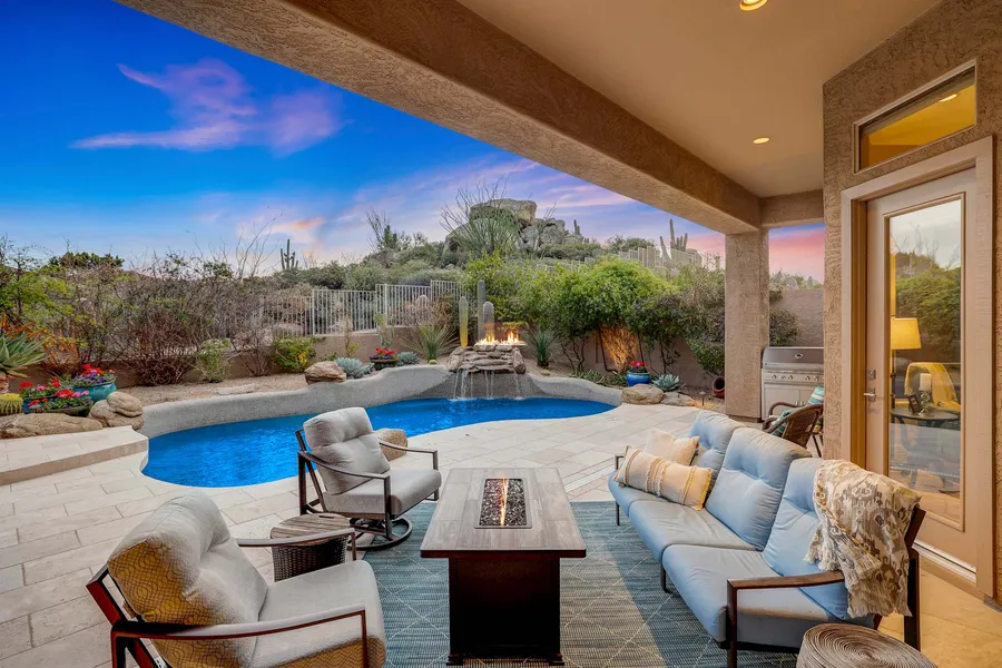 Abundant windows and doors flood the great room with natural light, offering picturesque views of the resort-style backyard. A heated pebble finish pool with a rock waterfall awaits, surrounded by lush landscaping and travertine hardscape. The large covered patio provides an inviting space for outdoor relaxation, while the backdrop of up-close boulder formations and NAOS privacy creates a serene setting.