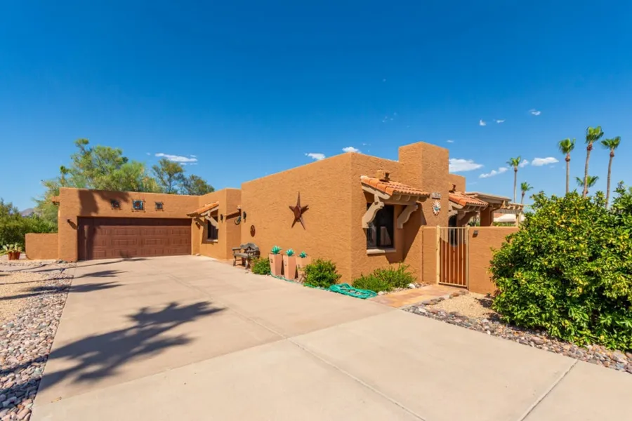 Discover this stunning corner lot home that merges desert tranquility with modern comfort. The inviting ambiance features tile floors and thoughtful touches like recessed lighting, exposed beams, and vaulted ceilings. The spacious living room is ideal for hosting guests, while the family room boasts a cozy stone-accented fireplace perfect for intimate gatherings. The chef's delight kitchen showcases stainless steel appliances, double wall ovens, extensive cabinetry, generous counter space, a chic backsplash, and convenient breakfast bars. The expansive main suite offers direct backyard access and a private bathroom with dual sinks and a walk-in closet. Outdoor living is redefined with a covered patio, attached Ramada, and a shimmering pool, ideal for unwinding or entertaining. The backyard is complemented by lush landscaping and plenty of seating areas to enjoy the serene surroundings.