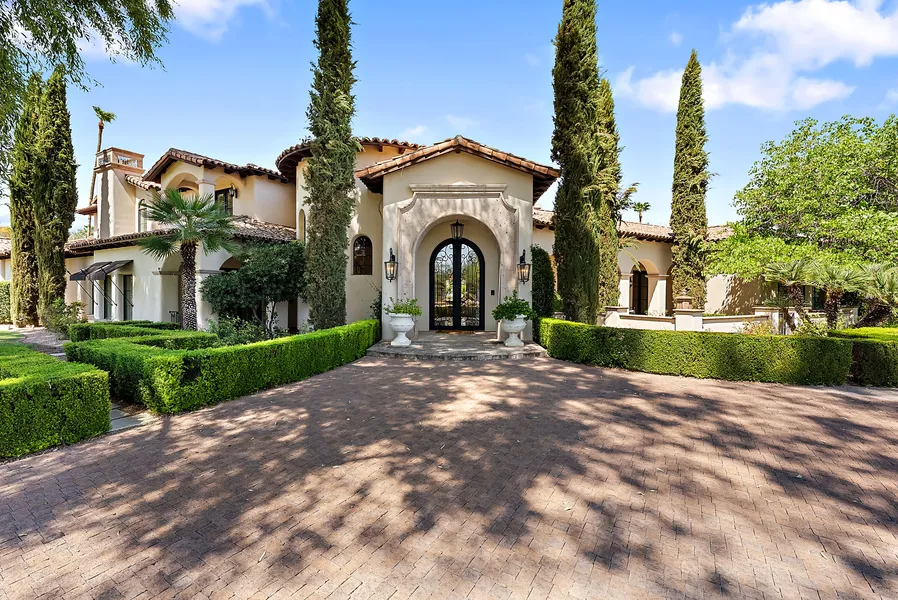 This distinguished residence, inspired by the elegance of Santa Barbara and situated in the heart of Paradise Valley, epitomizes luxury with its unparalleled finishes on a secluded and verdant corner lot. The property exudes an impressive street presence, drawing you in with its meticulous details and sophisticated design from the moment you arrive. Inside, the home boasts dramatic high ceilings adorned with custom elements, new designer lighting, and pristine white Venetian plaster, creating an immediate sense of grandeur. The interiors are further enhanced by exquisite stone and wood flooring, Cantera stone fireplaces, and custom furniture-grade cabinetry, all contributing to an ambiance of refined luxury.