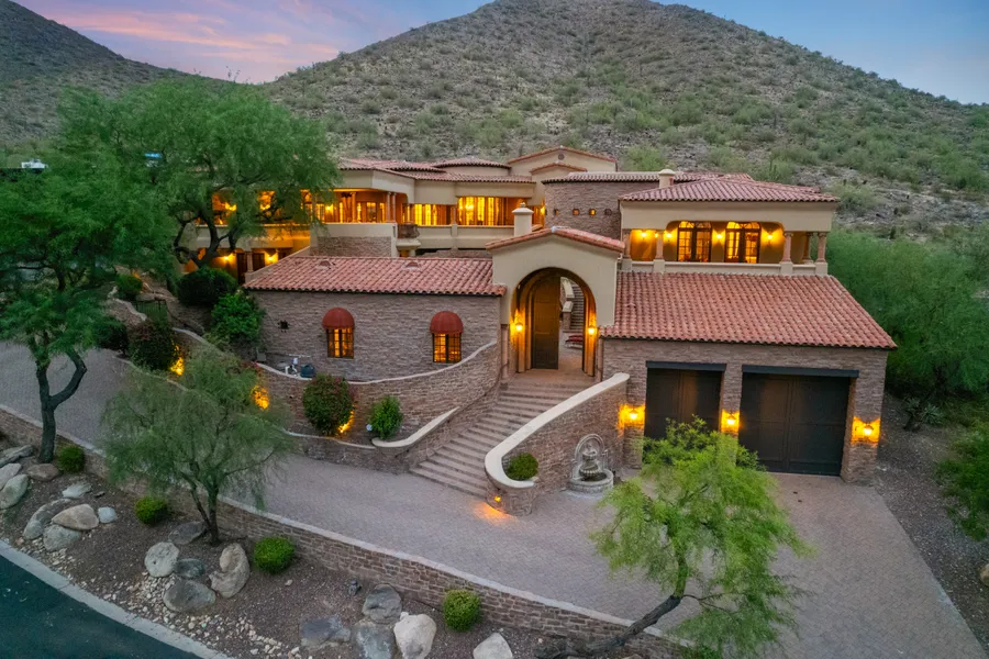 BREATHTAKING VIEWS, ULTIMATE PRIVACY AND ENTERTAINER'S DREAM in this guard gated golf club community. Perched on a hill in the back of the neighborhood, this home gives you the feeling of being on top of the world as you step out onto one of the many balconies where you can enjoy unobstructed views of Camelback Mountain and the shimmering city lights below. Imagine hosting ultimate gatherings in a home that's designed for entertaining! This paradise offers your very own movie theater, billiard room with bar, fitness center with sauna, wine cellar, sprawling open-concept living and kitchen area that flows effortlessly into a fully equipped bar and outdoor patio. A spa and 2 beautiful pools with waterfalls share a private courtyard space. Main house includes a separate guest quarters along with an additional detached guest house adjacent to the courtyard pool. Even a 7 CAR GARAGE including...