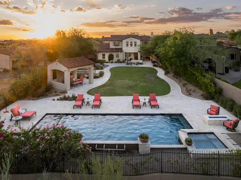 Highly sought after, gated DC Ranch Hacienda on one of a kind, oversized lot is tucked on an exterior cul de sac street with amazing curb appeal, faces open preserve and backs to natural area with picturesque McDowell mountains. Capture serene mountain and city light views from multiple areas of the home. Desirable great room home plan features 5 bedrooms, 4 baths, downstairs office and plus an upstairs office/den with wine fridge bar, and an expansive flex bonus room upstairs, with charming interior courtyard for entertaining. Enjoy seamless indoor/outdoor AZ living with a telescoping glass door from great room to picture perfect resort style backyard with scenic mountain backdrop, featuring oversized grassy area plus garden planters, outdoor covered ramada adjacent to generous heated pool and spa, and linear firepit, built-in BBQ with seating, covered patio, with ample hardscape space for seating/lounging. Stunning designer finishes including oak hardwood flooring throughout the home, light and bright oversized eat-in kitchen island, chic statement vent over gas range overlooking backyard, refined marble and tile selections throughout for a polished sophisticated appeal. Breathtaking views from second level primary suite with sitting area overlooking majestic McDowell Mountains, enjoy generous wardrobe, and spa like bath with freestanding bubble soaker tub. Convenient utility room with hall tree, three car tandem garage with cooling unit, plus spacious additional paved parking for four more cars. Quaint neighborhood park nearby. This showstopper is a unique opportunity in the coveted DC Ranch Haciendas.