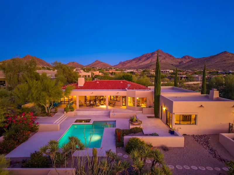 Breathtaking views of Pinnacle Peak, the valley, and city lights set the stage for this stunning home, nestled on just over an acre of mature desert landscape. Freshly painted throughout with all new switches and cover plates, this three bedroom plus office and three and a half bathroom home is a blank canvas ready for its new owner. The main house spans 2,791 square feet of single-level living, featuring two bedrooms, plus an office that could serve as a fourth bedroom, and two-and-a-half bathrooms. The thoughtful split floor plan provides privacy, while the detached 460 square foot guest house, with its own private entry, offers a bedroom, full bath, classic kiva fireplace, sitting area, and kitchenette. The main home welcomes you with an open great room, where an oversized sliding glass door fills the space with natural light and offers seamless views of the backyard. A modern firepla...