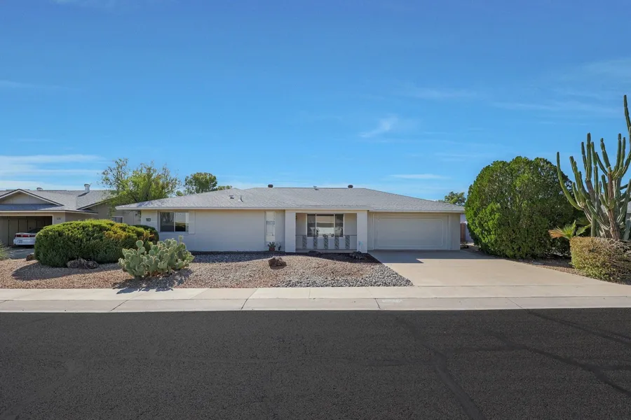 Tremendous value located in Sun City, within the 55+ community, this 2 bedroom 2 bathroom is steps away from golf and the community center. With a private pool, and located on a large lot, the possibilities for entertaining are endless. This floorplan is open, airy and the kitchen has an abundance of storage. This home was just painted inside, ready for your personal touches! Do not forget about the full enclosed yard and owned solar to have low electric bills. Come take a look today. This property is being sold ''AS IS''.