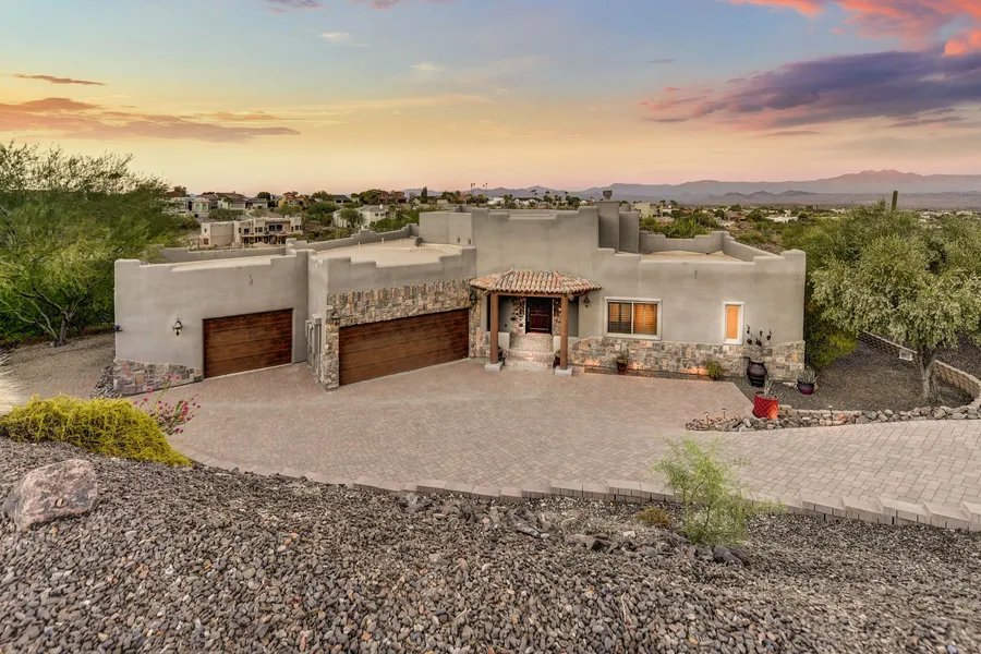Views, Views and more Views! Stunning panoramic mountain and desert views from both inside and out! If you are looking for unparalleled views this is the property for you! Kitchen, dining, living and primary rooms all look out to the majestic mountains! Tucked away and private location backing to a desert arroyo. Spacious gourmet kitchen with great room concept. Casual or formal dining area. Large living room w/ entertainment area. Split floor plan. Primary bedroom features a huge walk in closet with custom organizers, vanity w/dual sinks and separate tub, oversized shower and toilet area. Bonus room downstairs perfect for an office or 2nd entertaining spot. Tranquil backyard features amazing views with plenty of room for entertaining, BBQs or resort style relaxation.