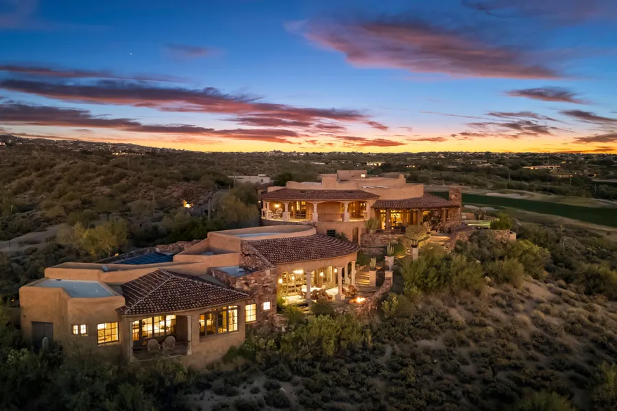 With Available Golf Membership: Experience luxurious desert living in this stunning Southwestern architectural masterpiece by renowned designer Lee Hutchinson. This exceptional estate features a flowing, organic Pueblo design, harmonizing seamlessly with the natural desert landscape. Encompassing an impressive 9,085 sq. ft., the main residence, built by Shiloh Homes, offers five spacious en-suite bedrooms. A hallmark of southwestern elegance, the home boasts six fireplaces, creating warm, inviting spaces throughout. Multiple living areas, expansive covered patios (totaling 4,000 sq. ft.), and sweeping views provide a blend of comfort and grandeur. Built in 2013 by Arnet, the guest house spans 2,540 sq. ft. and offers two en-suite bedrooms, a full kitchen, a spacious great room, laundry facilities, and a three-car garage. The guest house also features three fireplaces, its own hot tub, and generous outdoor living spaces, making it a private retreat within the estate. With a total of seven garage spaces, car enthusiasts will appreciate the climate-controlled four-car garage in the main house and an additional three-car garage in the guest house. Both garages provide extra-large storage rooms for ample space and organization. Situated on three expansive lots totaling 2.2 acres, this estate offers 490 feet of golf course frontage within the Desert Mountain Village of Lone Mountain II. Revel in unobstructed green fairway views and the majestic mountain panoramas that stretch across the horizon. The grounds also feature a cozy outdoor fire pit and beautifully landscaped areas designed to maximize outdoor relaxation and entertainment. This residence is a true oasis, combining privacy, luxury, and seamless indoor-outdoor living. Explore this remarkable estate with the attached motion video to capture the full essence of its unique design and breathtaking views.