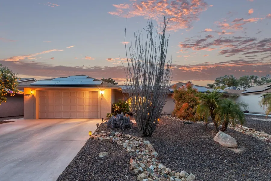 Discover your ideal retirement haven in the 55+ Sun City! This fantastic 3-bedroom home sits on a golf course lot, providing great vistas of the fairways. Its charm starts with a mature landscape & a private courtyard. The inviting interior features neutral paint, recessed lighting, window blinds, and tile & wood-look floors t/out. You'll love the formal living room and separate family room w/wet bar! The kitchen has built-in appliances, granite counters, tile backsplash, a pantry, and ample wood cabinetry. Main bedroom boasts backyard access, two closets, make-up vanity, and an ensuite w/dual sinks & bath grab bars. The laundry room, with cabinetry, is inside the 2-car garage. Check out the backyard's extended covered patio, where you can relax while enjoying golf course views! Just WOW!