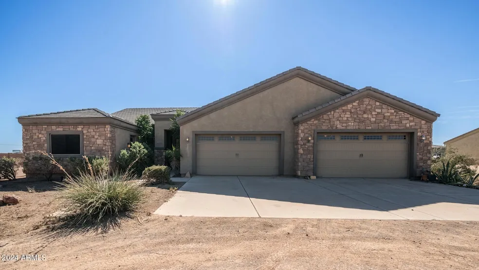 Discover your dream homestead on over 1 acre of land, stunning mountain views and just a short drive to Surprise for all your daily needs. This property is perfect for those seeking space and freedom, with no HOA restrictions. Fenced yard closest to the house, the back RV/carport comes equipped with water and 220 AMP electric service, ready for all your vehicles and projects. A car enthusiast's dream, the 5-car garage features extra-tall doors for over height vehicles, a 220 outlet, and climate control, making it comfortable year-round. Inside, the chef's kitchen boasts granite countertops, upgraded maple cabinets with accent lighting, a walk-in pantry, and ample counter space for all your culinary adventures. The spacious primary suite offers a double-door entry, a private exit to the back patio, a huge walk-in closet, and a luxurious bathroom with a spa tub and walk-in shower. Additional highlights include two secondary bedrooms with walk-in closets, and a fourth bedroom with a separate entrance to the front of the home. The open floor plan is designed for entertaining, with seamless flow to the large covered patio, perfect for enjoying the breathtaking views of the White Tank Mountain Range. Don't miss this rare opportunity to own a unique, spacious property in a peaceful setting!