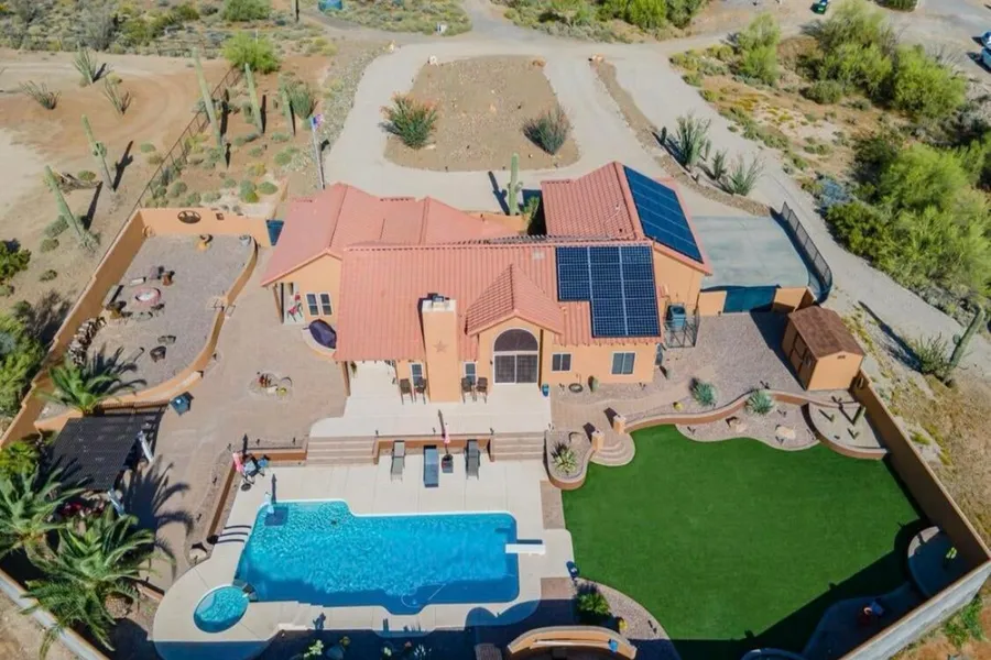 The outdoor space is an entertainer’s paradise, complete with a deep dive lap pool, spa, and ample areas for family, friends, kids, and pets to gather. Enjoy cozy evenings around the firepit, or engage in friendly competition with horseshoes or cornhole. With over 10,000 square feet of open space, the possibilities are endless—build a casita, add horse facilities, or create your own custom space for boats, RVs, or motorsport toys.