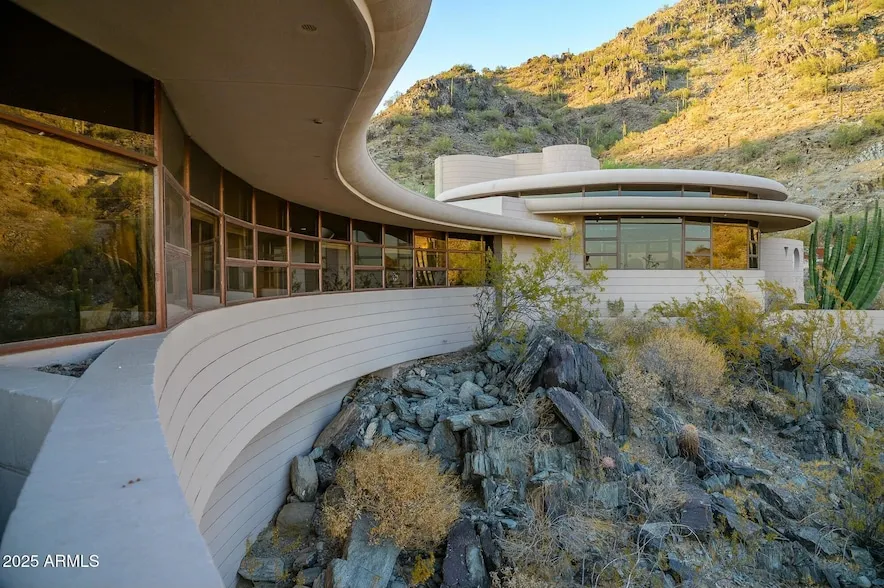 Own one of the most historic pieces of art and architecture with this famous Frank Lloyd Wright house, called The Circular Sun House / Norman Lykes. The home is hilltop with views from every room. 3 bedrooms plus an office atop the home, a library/bar area and den with built-in entertainment cabinet could be the 4th bedroom. Designed to blend in with the curves of the surrounding desert mountain, this iconic masterpiece was the last home designed by Wright. Overlapping concentric circles create a floorplan that flows seamlessly from one room to another while every room takes in unobstructed majestic views of Palm Canyon and the city below. Curved walls, clad in golden-hued Philippine mahogany throughout cover the three bedrooms and hallway, reflecting the natural light of Palm Canyon... Sprawling entertaining spaces flow outside to ample patios and a crescent-shaped pool. See video featured in Architectural Digest. Furniture included!Inquire about opportunity to purchase this home with a self-directed IRA and/or fractional ownership to create an investment opportunity with this rare property. This home was designed shortly before the completion of Frank Lloyd Wright's Guggenheim Museum in NY. Renovated in 1995. In 2019, four new Trane AC units. The kitchen is plumbed for gas (propane). Qualified buyers only. Fractional sale once all buyers are in place.