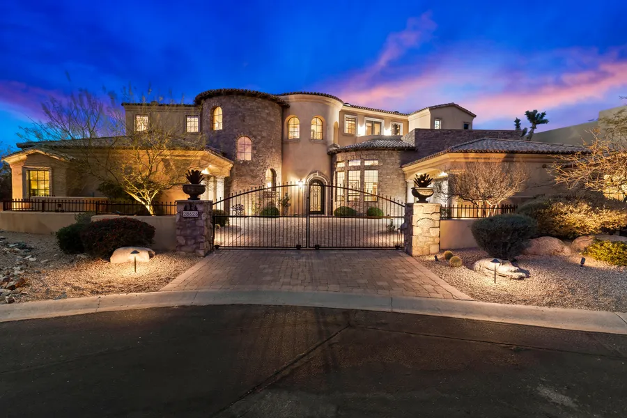 Nestled in the guard gated community of Candlewood Estates is a prestigious enclave perfectly situated on an oversized lot. This exceptional estate redefines luxury living, from the grand façade to the breathtaking balcony views, every detail exudes elegance. The heart of the home is a chef's dream kitchen, featuring top-tier appliances, bespoke cabinetry, and a seamless flow to casual dining and living areas. Indulge your passion for entertaining in the dedicated wine cellar and sophisticated bar. The primary suite is a private retreat, complete with a spa-inspired bath, dual vanities, and a spacious walk-in closet. Guest accommodations include a serene junior suite and additional bedrooms, each thoughtfully designed with premium finishes. Step outside to a resort-style backyard with meticulously designed landscaping, perfect for gatherings under the stars. Relax on the expansive balcony, offering panoramic views that capture Arizona's iconic sunsets and surrounding Sonoran McDowell Mountains . Blending timeless sophistication with modern functionality, this home is a rare offering in an exclusive community. The Community is located within the master subdivision of Troon which offers Browns & Pinnacle Peak Hiking Trails coupled with multiple award winning golf courses, fine dining and shopping all within minutes of the home. Come Experience unparalleled luxury in one of the most exclusive subdivisions in all of North Scottsdale.