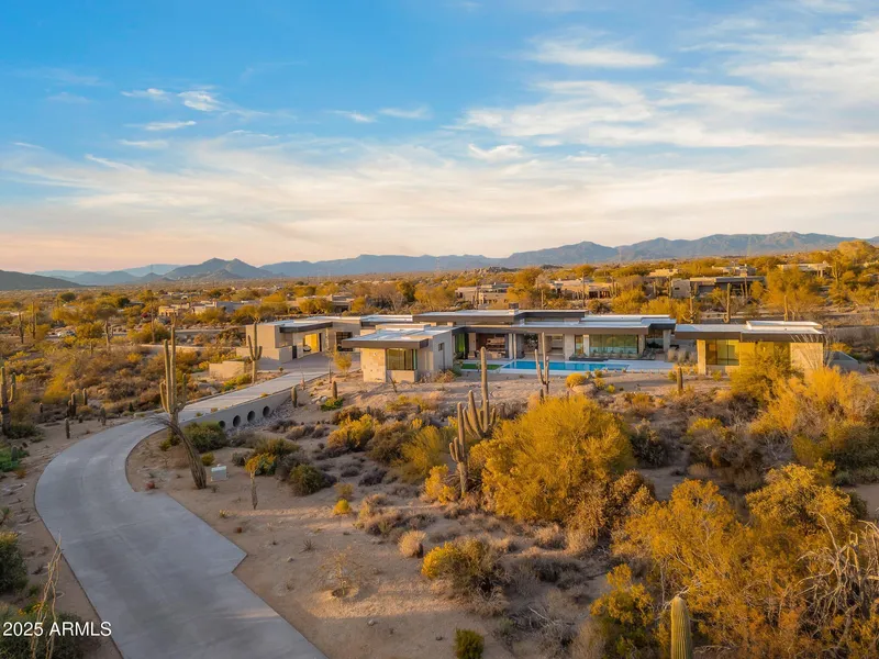 Designed by Award-winning architect C. P. Drewett this seamlessly crafted modern home in north Scottsdale's Estancia Golf Community is jaw dropping. With a nod toward Mid-Century Modernism—characterized by its boxy architecture, straight lines and minimalist nature—the home's design takes full advantage of its stunning setting. Pocketing doors slide open to allow indoor/outdoor living, creating a pavilion-like ambience where the spaces meld into one another. A palette of materials includes hemlock, bronze, and textured limestone inside and out. The organic work of modern architecture is a perfect example of how a well-executed design can so effortlessly respond to the true essence of its site. The modern kitchen is beautifully designed complete with Wolf convection steam oven, speed oven, induction cooktop, gas cooktop, coffee system and a hidden pantry with appliance garage, wall oven and ice machine. Continue through the home to find a split primary suite, two guest suites, an office in the main house, and a detached guest casita with a bedroom suite and sitting area. A 1,322-square-foot luxury car lounge provides the perfect setting to showcase your auto collection while entertaining.