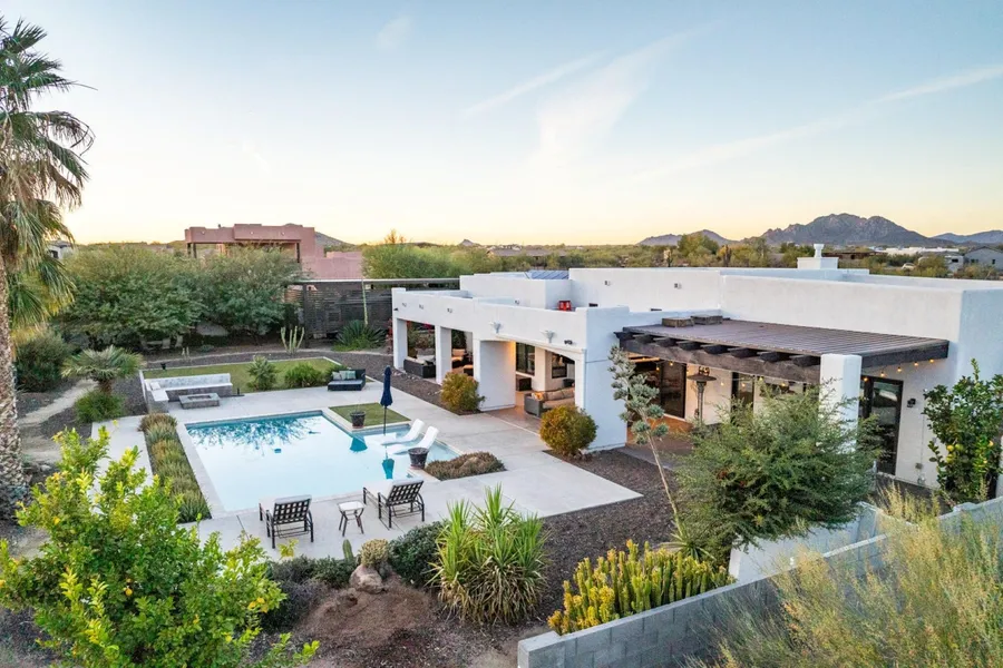 This beautiful North Scottsdale estate is unparalleled in modern design and craftsmanship, it's nestled on over an acre of professional desert landscape & design. Comes complete with owned solar, separate guest casita, horse set up, paved roads & a resort style backyard that takes backyard entertaining to a whole new level. This property was truly designed so that one could enjoy Arizona's beautiful weather year round, it's modern architecture & desert living at its best. Loaded with thoughtful, eco-conscious features, a whole house water filtration system and a HEPA air filtration system for a healthier living environment. A supersized 4 car garage and best of all no HOA. Easy access to unlimited riding trails, hiking & biking.