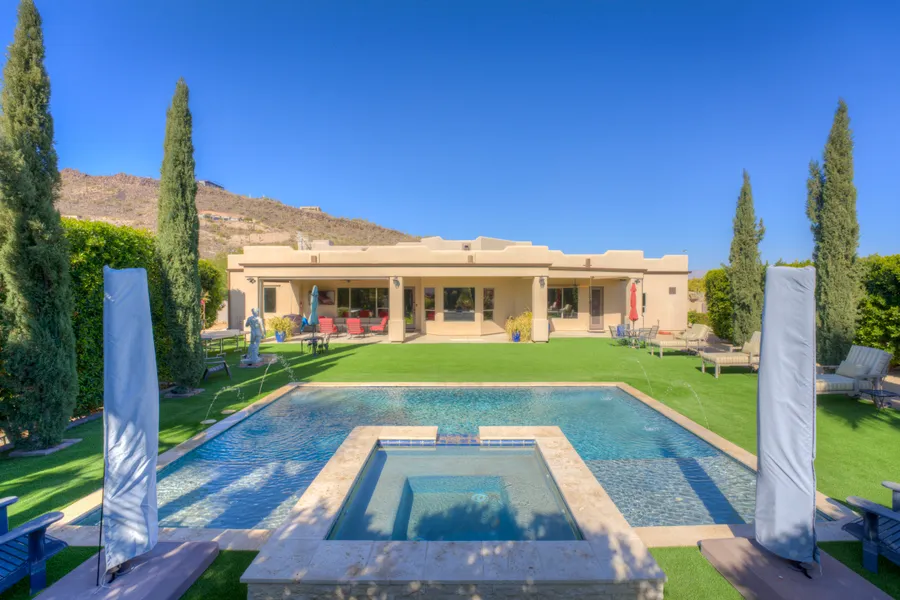 Private oasis with OWNED SOLAR- ZERO ELECTRIC BILLS! This exquisite home boasts an entertainer's dream kitchen with dual islands, a built-in fridge/freezer, gas range, and elegant cabinetry extending into the laundry room. Tray ceilings and stylish lighting enhance the main living areas, while a grand stone fireplace anchors the room. The spacious primary suite features a luxurious en suite, oversized closet, and private backyard access. Two bedrooms share a Jack & Jill bath with individual sinks, while the 4th bedroom's double doors also make it an ideal office. Step outside to a resort-style pool & spa, framed by sculpted hedges for ultimate privacy. A private gated entrance welcomes you to this NO HOA property with a 4 CAR GARAGE, room for RV PARKING, storage shed or horses.