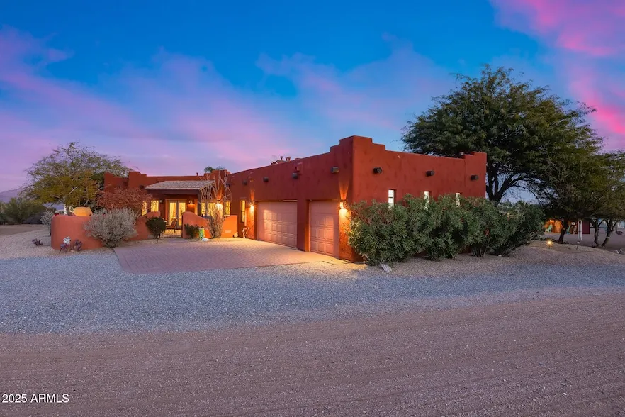 PRIVATE desert retreat with PRIVATE WELL, POOL, PREMIUM HORSE FACITLITES, FOUR PATIOS, 7 CAR GARAGE SPACES! Views and trails in all directions! Every room in this custom-built sanctuary has an outdoor patio. The gourmet kitchen features a top-tier gas range, granite counters, expansive island, and a whole-house water filtration system. Huge bonus office/flex space off the charming Primary Suite. Split floor plan ensures privacy and comfort. Gas fireplaces in the living and family rooms. Equestrians of all types will love the 6-stall barn, detached tack room, and huge arena. Car and ''toy'' enthusiasts, don't miss the 3-car attached garage and the detached, climate-controlled 4-car garage! All 2.5 acres are within no-climb fencing. Two gates-no turning around! Too rare to miss!!