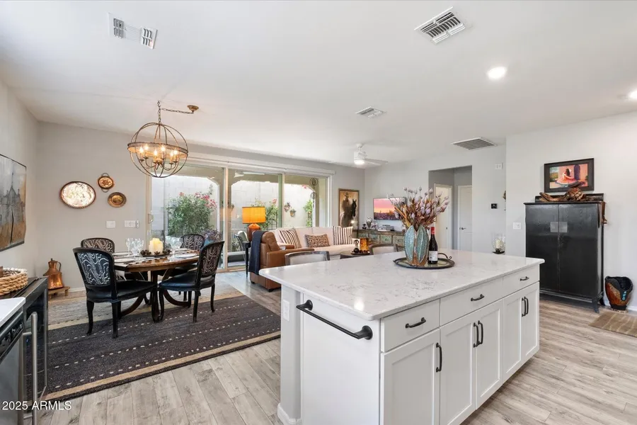 This stunning single-story home seamlessly blends modern design with the tranquility of the desert landscape. A welcoming façade leads to an open-concept floor plan featuring soaring 9-ft. ceilings and a spacious great room, creating an airy and inviting atmosphere. Expansive 15-ft. sliding glass doors, adorned with custom electric linen blinds, open to an extended covered patio, offering a seamless indoor-outdoor living experience. Surrounded by beautiful mature landscaping and a drip irrigation system, the backyard is a peaceful retreat for relaxation and entertaining. The heart of the home is the expansive kitchen, showcasing Timberlake 42-in. upper cabinets, sleek quartz countertops, and a generous center island—perfect for gathering and culinary... CONTINUE READING... ... creativity. The home's contemporary aesthetic is enhanced by stylish laminate wood-style flooring that flows thr...