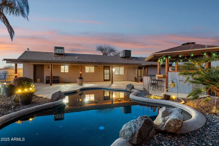 Horse property with a lot to offer! This 3 bedroom 2 bathroom home is easy to navigate with a neutral pallet. Backyard is ready to entertain- gazebo with fan, built in bbq with fridge, firepit, pool & spa. 5 stall block barn with attached turnout, 90X130 arena, tack shed, wash rack, 4 extra stalls covered for supply's etc.. with automatic waters and lights. Come and see!
