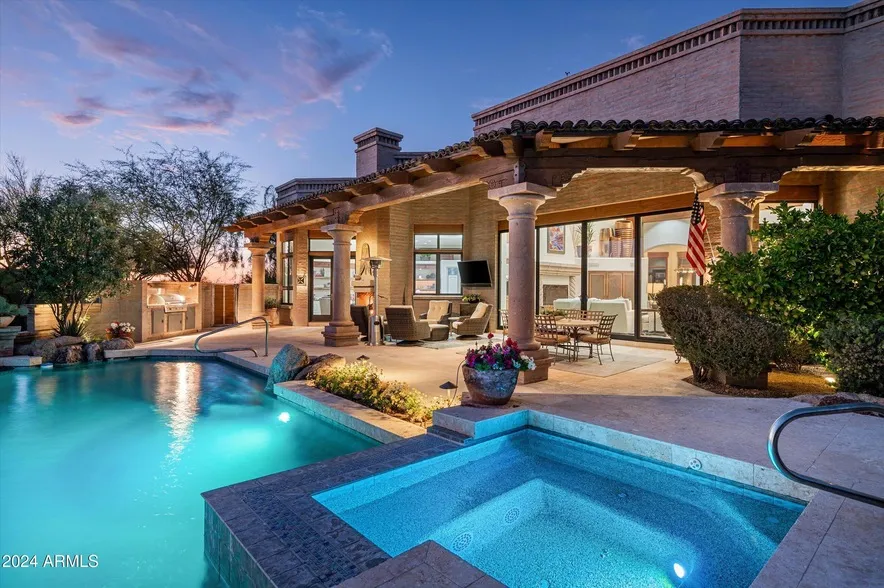 Golf Membership available! Nestled on the 5th fairway of the Renegade golf course in Desert Mountain, this unique Mexican Colonial residence offers timeless charm and unparalleled views. A serene courtyard entry welcomes you into a gracious foyer that flows into a spacious great room, complete with a stunning cantera fireplace, elegant ceiling beams, and a beautifully designed dry bar.The formal dining room features a sophisticated built-in buffet and boasts breathtaking mountain and sunset vistas. The expansive kitchen, adorned with exquisite granite countertops, opens to a cozy hearth room, perfect for intimate gatherings.The luxurious master retreat includes a charming fireplace, a loft office, and a private balcony with panoramic views in every direction. designed with a shared sitting room and patio access to enjoy spectacular sunset views.Step outside to a captivating patio space featuring a built-in BBQ, a fireplace, and a sparkling pool and spa. From the tranquil morning sunrises to the glittering city lights at night, this home is an entertainer's dream and a haven for creating cherished memories with family and friends. See membership information in the document tab.