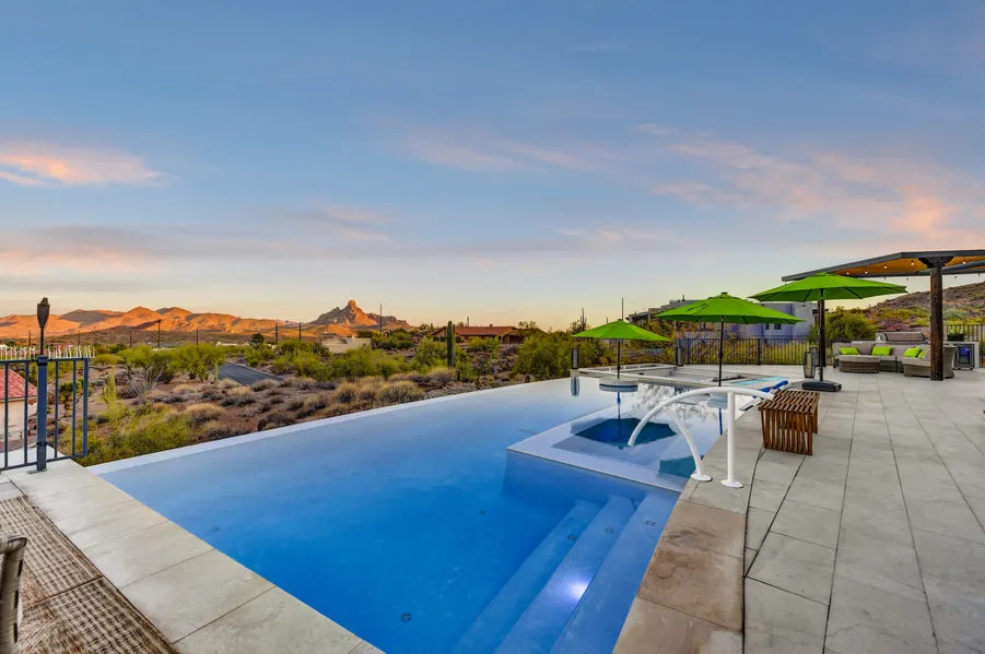 Nestled on over an acre of pristine desert landscape, this custom estate is a rare find, seamlessly blending contemporary sophistication with the natural beauty of Arizona. From the moment you step inside, you'll be captivated by panoramic views of Four Peaks and Fire Rock, framed by expansive windows that bathe the home in natural light. The open floor plan and soaring ceilings create a sense of space and grandeur, enhanced by architectural details such as stunning vigas and three fireplaces. The heart of the home is the chef-inspired kitchen, featuring illuminated white glass cabinets, high-end stainless steel appliances, a sleek induction cooktop, and luxurious terrazzo and quartz countertops. Whether you're preparing a gourmet meal or enjoying your morning coffee, the breathtaking views from the kitchen are sure to inspire. Step outside to your east-facing covered patio, where you ca...