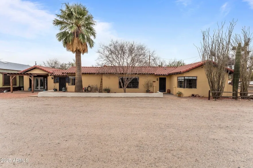 Motivated Seller!! Enjoy the quiet charm of this Spanish-style retreat on 2.9 serene acres with stunning Weaver Mountain views. This 3 bed, 2 bath home features Saltillo tile, beamed ceilings, arched doorways, and thick adobe walls blending classic beauty with cozy comfort. Vaulted ceilings and a welcoming fireplace create a warm, spacious feel throughout. Outdoors, relax among mature trees, saguaros, palms, and your own orange tree. A fully fenced dog run is perfect for your four-legged companions, and the massive 2,000 sq ft garage/workshop offers endless space for hobbies, projects, or storage. The full RV hookup is ideal for hosting guests or generating extra income. There's even room to build your dream horse setup. Peaceful, private, and full of character this Wickenburg gem is ready to welcome you home.