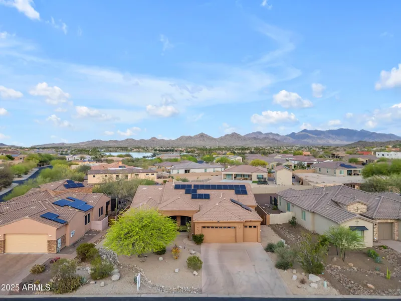 Welcome to luxury desert living at its finest! This stunning 3,300 sq ft custom home sits on an expansive 1/3-acre lot in the highly sought-after neighborhood of The Vistas at Estrella Mountain Ranch, just a short walk from South Lake and surrounded by breathtaking mountain views. Step inside to find an elegant and spacious split floor plan featuring soaring 10' and 12' ceilings, travertine flooring throughout, and brand-new carpet in the bedrooms. The oversized Owner's Suite offers a private retreat with a separate exit to the tranquil backyard oasis. A private guest bedroom and bath are thoughtfully separated from the other three bedrooms, ensuring comfort and privacy for family and guests alike. At the heart of the home is a gourmet kitchen, complete with granite countertops, a chef's workstation, and a seamless flow into the spacious great room - perfect for entertaining! The expansive backyard is a true retreat, featuring a Pebble Tec diving pool, breathtaking mountain views, and low-maintenance desert landscaping. Whether you're enjoying a morning coffee with a view or a sunset swim, this outdoor space offers peace and serenity. Beyond your home, Estrella Mountain Ranch provides an exceptional lifestyle with upscale amenities and everyday conveniences. Golf enthusiasts can enjoy the Nicklaus-designed course, managed by Troon Golf. Water lovers can explore the lakes with paddleboats, sailboats, and kayaks available at the Yacht Club. The Starpointe Resident's Club boasts a fitness facility, aerobics room, heated lap pool, swimming pool, water slides and water park, while the Presidio Resident's Club offers a great room, demo kitchen, sports lounge, state-of-the-art fitness facility, heated pool, splash pad, sitting areas, grills and fire pits. Outdoor enthusiasts will love the neighborhood pickleball courts, tennis courts, and the over 65 miles of trails for hiking and biking adventures. Just minutes from your doorstep you will find a variety of restaurants, shopping, schools, and essential services. Offering the perfect blend of luxury, comfort, and convenience, don't miss the chance to make Estrella Mountain Ranch your home.