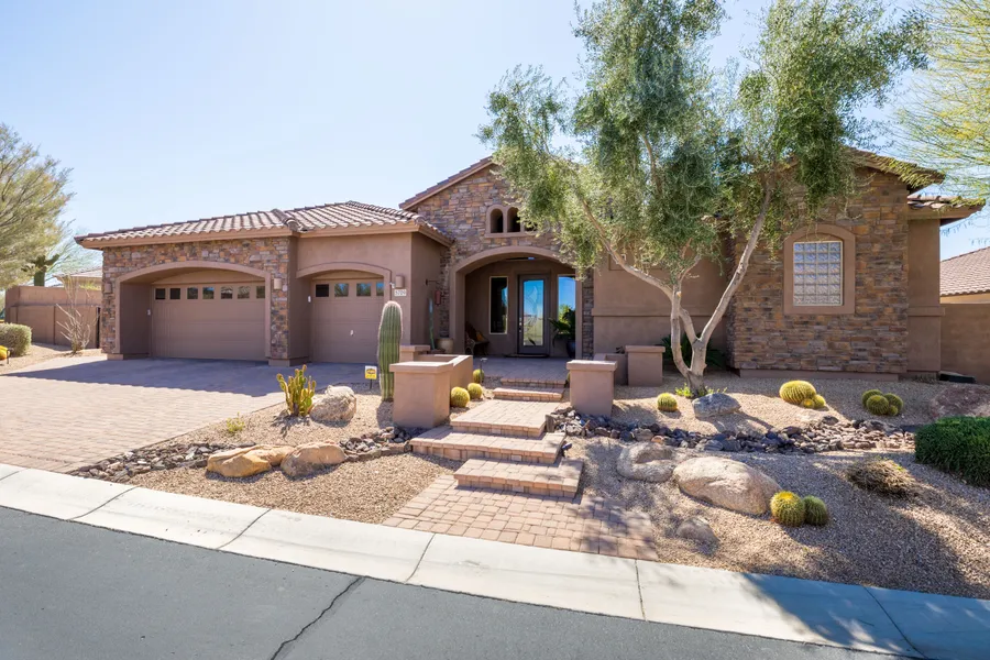 Nestled within the sought-after Lone Mountain community, this exceptional 4-bedroom, 3-bath residence showcases the neighborhood's beloved Torrey Pines open-concept floor plan. Designed for effortless living and entertaining, the home features numerous upgrades, including recent Pergo wood flooring throughout and designer window treatments. The chef's kitchen is a true centerpiece, equipped with GE Monogram appliances, a gas cooktop with built-in wok station, custom roll-out shelving, a wine fridge, and elegant pendant lighting. The expansive eat-in kitchen offers an extended counter-height breakfast bar and ample space for a dining table. Flooded with natural light, the great room boasts built-in wood cabinetry and two walls of windows framing serene desert views. Paver stone walkway leads to stained glass front door; den with custom stacked stone wall is warm and inviting, with adjacen...