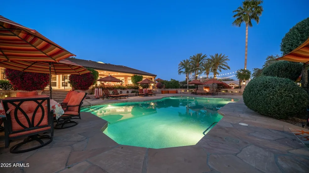 A hidden treasure on 1.20 acres. Old World craftsman ship featuring lighted ceilings from the Savoy Hotel, luxurious wood trim throughout, entertaining great room, spacious master retreat and master bath and closet. Den/office and secondary bedroom with private bath. The grounds are retreat, massive covered patio, outdoor kitchen and Ramada inviting and suited for large groups of family and friends. Detached Guest House can be used for VRBO, as well as children's playhouse. This Dave Hanson designed home is a special niche home private and so much to offer. Garage has full pull down storage and large walk-n A/C vault. Priced at current Phoenix Valuation Appraisal. A rare find and a jewel in Scottsdale/PV area.