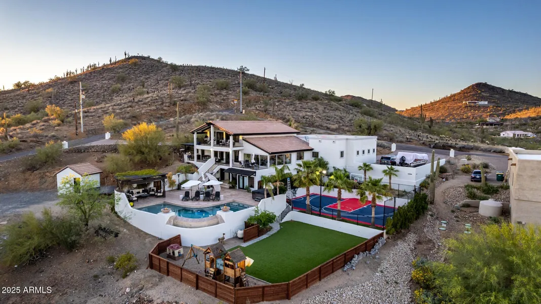 Prime mountain location, this gorgeous remodeled home offers an unparalleled blend of luxury, privacy, and panoramic views over 1.4acres of pristine Arizona desert. The property's unique and versatile layout makes it ideal for executives, multi-generational families, entertainers or those seeking a quiet environment. The exquisite master suite serves as a private retreat encompasses the entire upper level, complete with a wood-burning fireplace. Separate covered balconies capture breathtaking vistas from both sides of the home. On the main level, the bright gourmet kitchen, elegant dining room, and spacious great room are thoughtfully designed to maximize the stunning unobstructed surrounding scenery. Many options; horses or adding a guest house! Seller is motivated! This exceptional home is further enhanced by a host of premium amenities, including two full-size laundry rooms for ultimate convenience located on the lower level and main level. You will find even more reasons to enjoy our amazing weather with the sparkling Negative-Edge Pool with a charming Pergola, the Sports Court, a designated Children's Play area and several covered balconies and patios. Plenty of parking in three-car oversized garage featuring sleek epoxy flooring with additional parking on the oversized lot. Recent upgrades by the seller such as a private well, a new upgraded alternative septic system, a freshly painted exterior, and new carpets in the bedrooms to ensure modern comfort and efficiency for the discerning homeowner. Throughout the residence, high-quality finishes abound, from stainless steel appliances, travertine and hardwood flooring to granite and marble countertops, complemented by 6.5-inch baseboards and tasteful hardware in oil-rubbed bronze and brushed nickel. This property represents the pinnacle of Arizona desert living, where luxury, functionality, and natural beauty converge in perfect harmony.