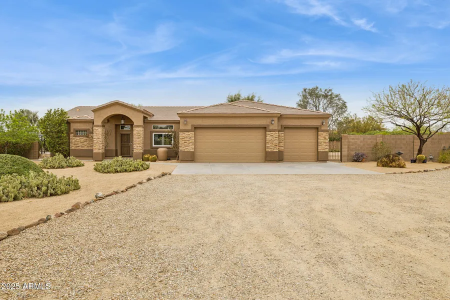 Tucked at the end of a peaceful block in North Phoenix, this stunning single-level home offers the perfect blend of comfort, style, and tranquility. With 4 bedrooms, 2.5 baths, and a backyard oasis, this is where lasting memories are made. From the moment you arrive, the curb appeal welcomes you with a freshly painted exterior, stacked stone accents, and desert landscaping that enhances the surrounding natural beauty. Step inside to soaring 10' ceilings and sunlight streaming through newer windows and doors, including expansive 16' sliding doors in the great room that seamlessly blend indoor and outdoor living. Thoughtful upgrades include contemporary lighting with smart switches, wide baseboards, and sleek door hardware. At the heart of the home, the warm kitchen is... designed for gathering. Rich hickory cabinetry, granite countertops, and a spacious island with breakfast bar seating make it functional and beautiful. Enjoy the convenience of a walk-in pantry, R/O filtered water, and a cozy eat-in dining area framed by elegant wainscoting and a stylish chandelier. The primary suite is a true retreat, set apart from the secondary bedrooms. The tray ceiling adds character, while direct patio access allows you to take a dip in the pool or hot tub or just enjoy a breath of fresh air. The spa-like ensuite bath features dual sinks, a large step-in shower with multiple shower heads, a soaking tub, and a spacious walk-in closet with built-in organization. On the opposite side of the home, you'll find three additional bedrooms--two with walk-in closets, one with built-in storage, and one with sliding doors to the backyard. A shared full bath is nearby. The versatile formal dining area is ready to host your gatherings but could also serve as a game room or home office. A dedicated laundry room includes a utility sink and full-size refrigerator. Step outside and discover your backyard paradise. The covered patio with misters invites you to unwind while overlooking the sparkling 30,000-gallon heated saltwater diving pool with a peaceful rock fountain. Whether you're soaking in the pergola-covered hot tub, picking fresh fruit from the trees, or dreaming of adding a casita or sport court, the possibilities are endless. And let's not forget the breathtaking mountain views that make every sunset magical. For those who love their toys and hobbies, the 3-car garage is a dream with epoxy floors, built-in cabinetry, a workbench, EV charging, and even a mini-split system for comfort year-round. Plus, an adjacent RV gate leads to additional storage space. Set on a private full-acre lot at the end of a short gravel road, you'll enjoy the best of both worlds--seclusion and convenience. With city water, easy access to I-17, and top-rated schools like Great Hearts Academy Anthem, plus nearby shopping, dining, and miles of scenic trails, everything you need is right at your fingertips. Welcome home!